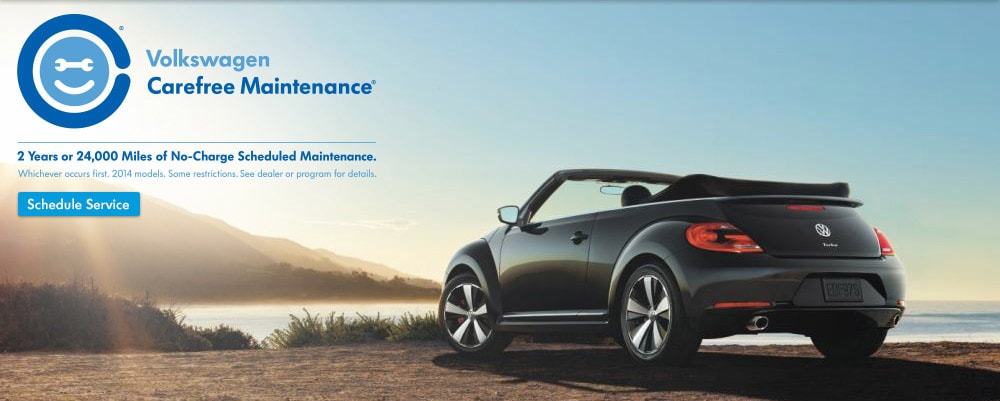 * The Volkswagen Carefree Maintenance Program covers the vehicle's scheduled maintenance for two years or 24,000 miles, whichever occurs first, only on 2014 models. This program does not apply to 2009-2013 models. Some restrictions apply. See dealer or vehicle maintenance program booklet for details.
